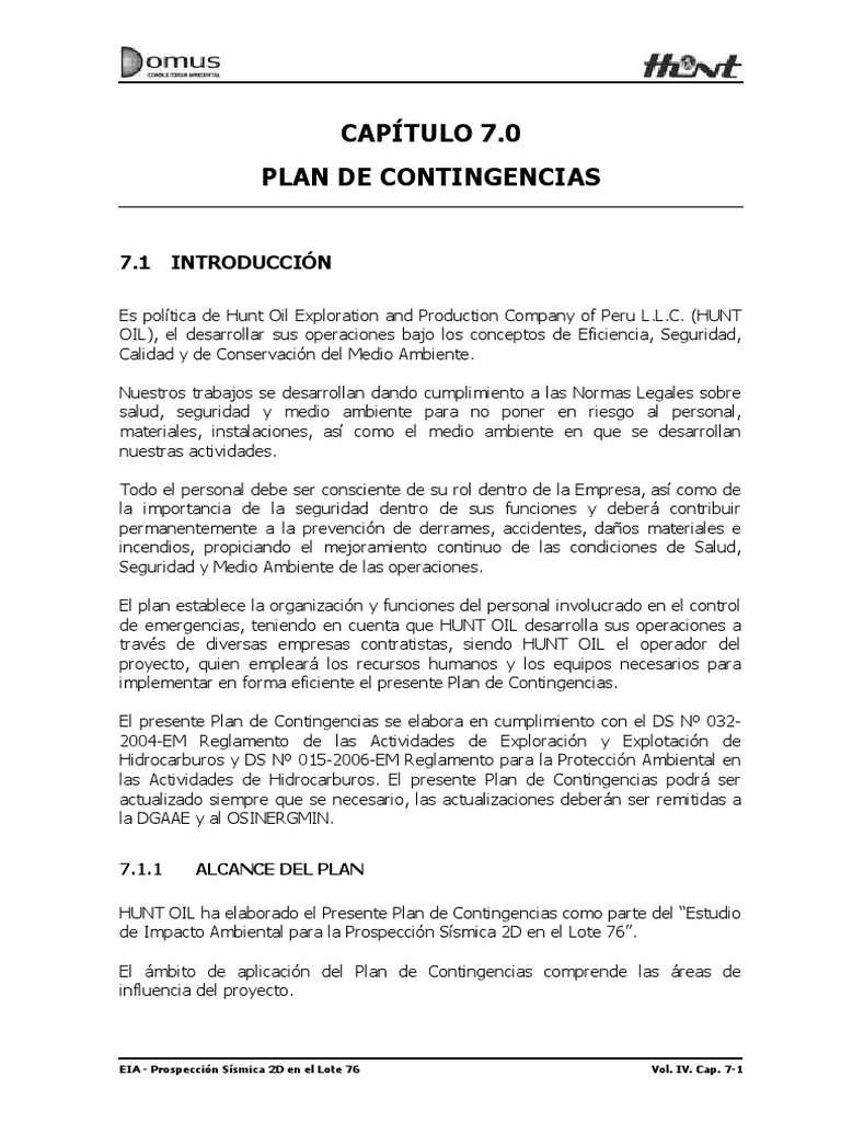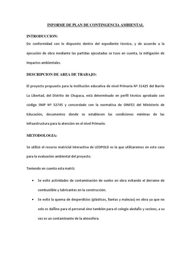 Plan de contingencia ambiental contingencia de incendios los materiales inflamables que se usarán en el proyecto son reducidos en cantidad y volumen; Con el nuevo plan se implementarán fases preventivas y combinadas, así como medidas para partículas pm 10 y 2.5. El plan ha sido desarrollado teniendo en consideración la ley nº 28551 que establece la obligación de elaborar y presentar planes de contingencia, así como el anexo nº 2 del d.s. Plan de contigencia ambiental por derrame de productos quimicos by victor_cerro. Percy augusto martel moreno superintendente de seguridad y medio ambiente compañí a minera condestable s.a.a.